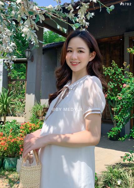 Váy tơ trắng trang trí duy băng nâu VS782